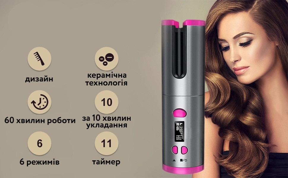 • Налаштування обігріву та таймера дозволяють вибрати бажану температуру та час для створення щільних або розпушених локонів та хвиль;