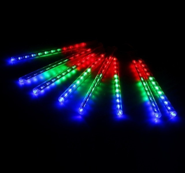 Новогодняя гирлянды сосульки, располагаются на проводе длиной 3м, на котором расположено 8 сосулек по 50см. В наличии переходник, что дает возможность соединить последовательно наборы гирлянд и сделать очень длинную гирлянду.