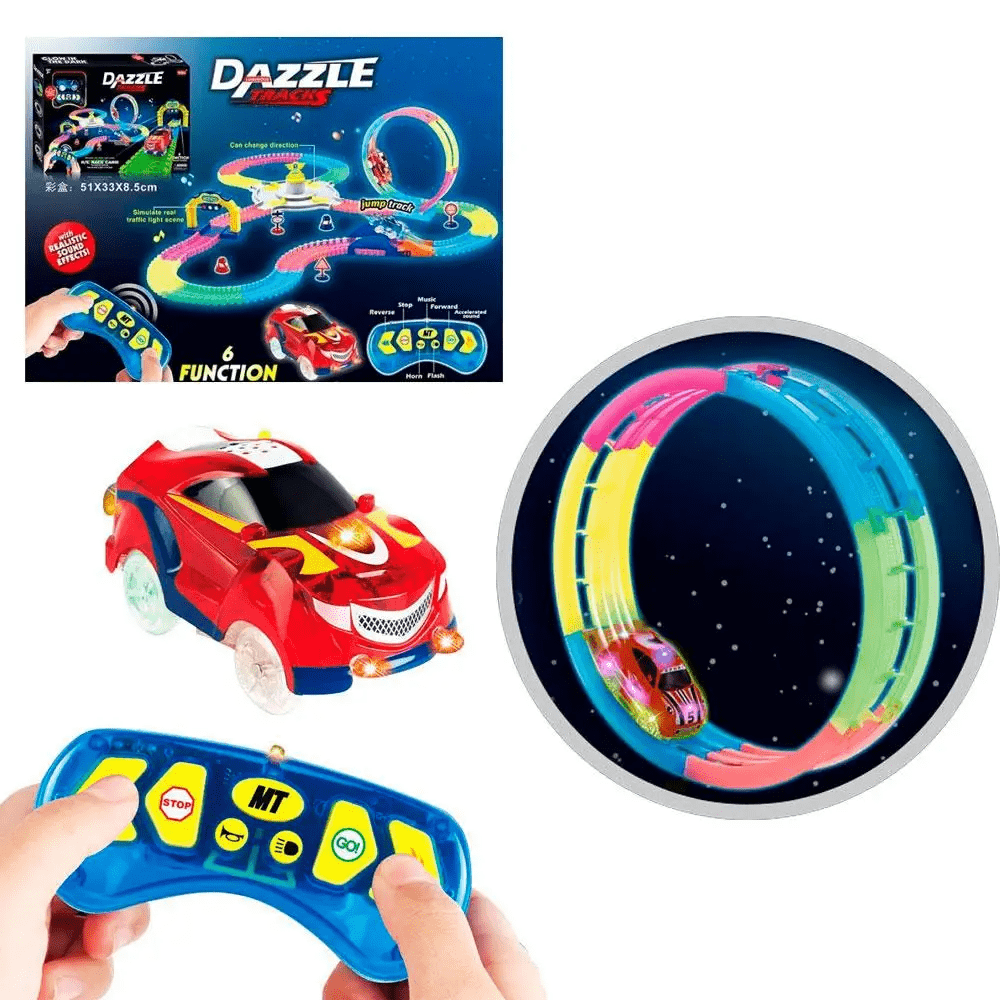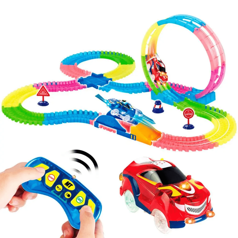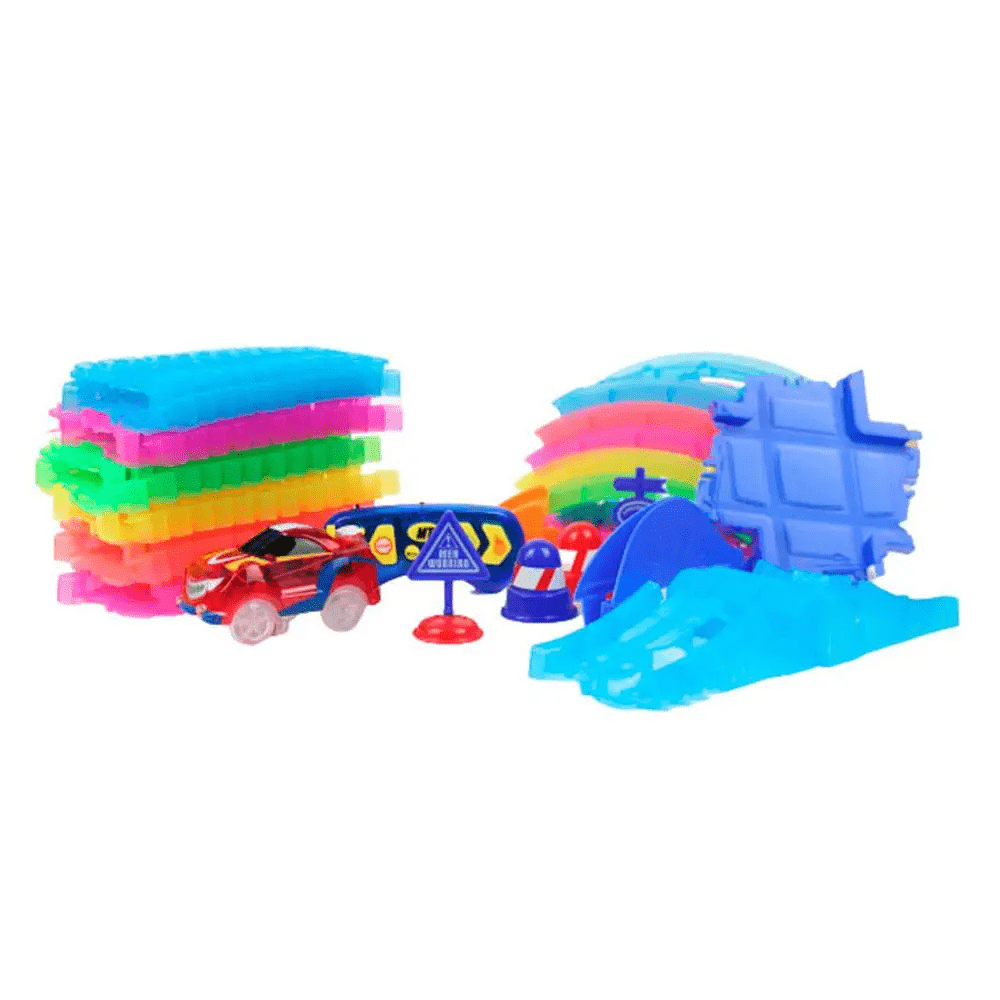 Частини дороги швидко складаються один до одного і можуть бути зігнутими або розігнутими, створюючи петлі та тунелі для легкої машини. Чарівний трек обов’язково розважить та займе ваших дітей на довгий час. Частини дороги дуже просто з’єднати разом. Через кілька секунд у Вас буде власний спідвей. Гоночна машинка оснащена яскравими світлодіодами. Всі деталі треку легко гнуться і світяться в темряві.