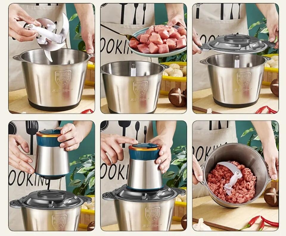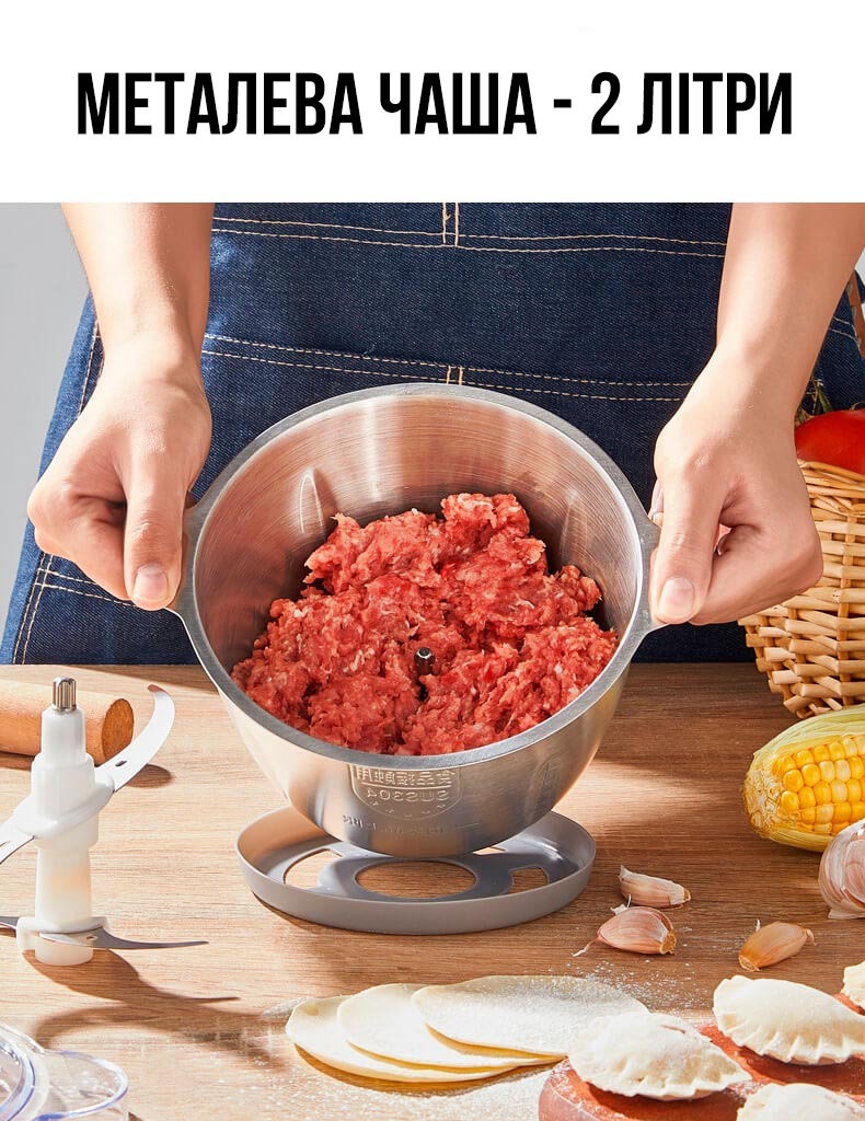 - Універсальний кухонний подрібнювач з нержавіючою чашею. У ньому Ви без зусиль подрібните зелень, овочі для салату, фрукти, ягоди, а також м’ясо та лід. Цей невеликий, але дуже корисний прилад буквально працює за вас: просто засипте інгредієнти в чашу, натисніть кнопку, і він все зробить сам. Секрет ефективної та швидкої роботи подрібнювача полягає у подвійному ножі з якісної нержавіючої сталі та потужному моторі.