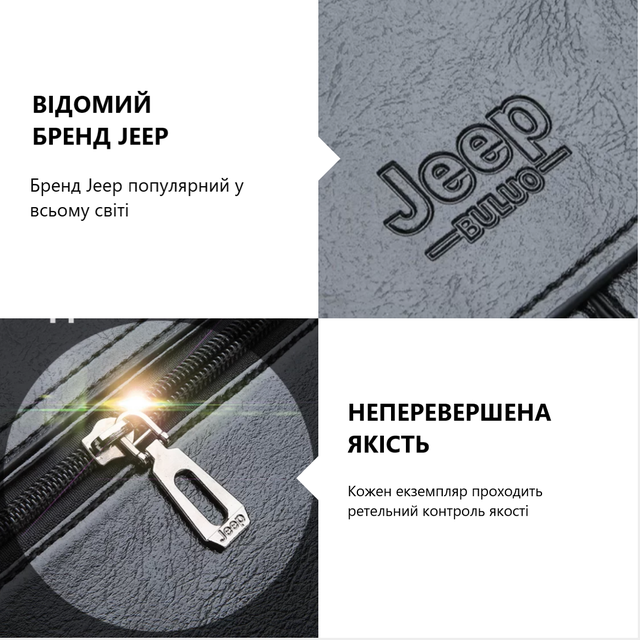 - Чоловіча фірмова сумка популярного бренду “Jeep” виготовлена з чудової штучної шкіри, зносостійкий і міцний матеріал. Класичний стиль, продуманий дизайн, виглядає дуже стильно і презентабельно.