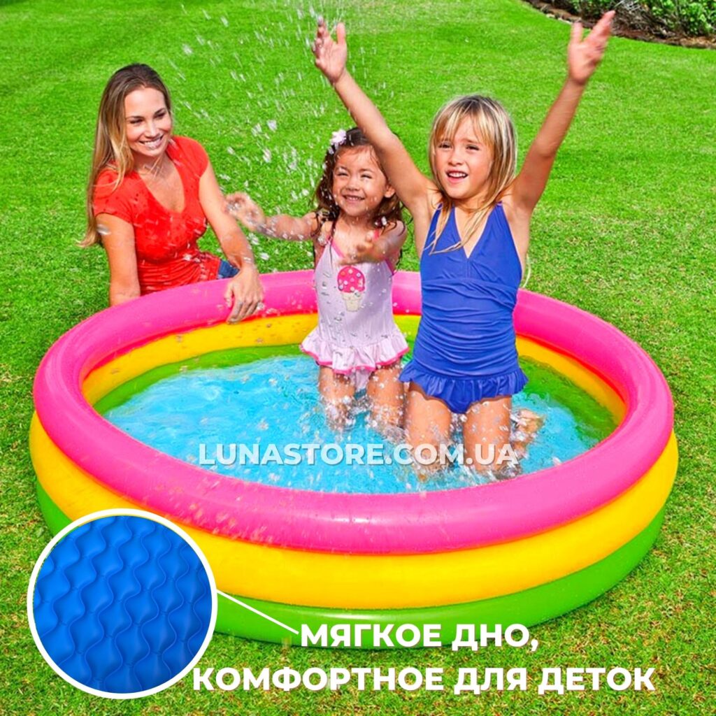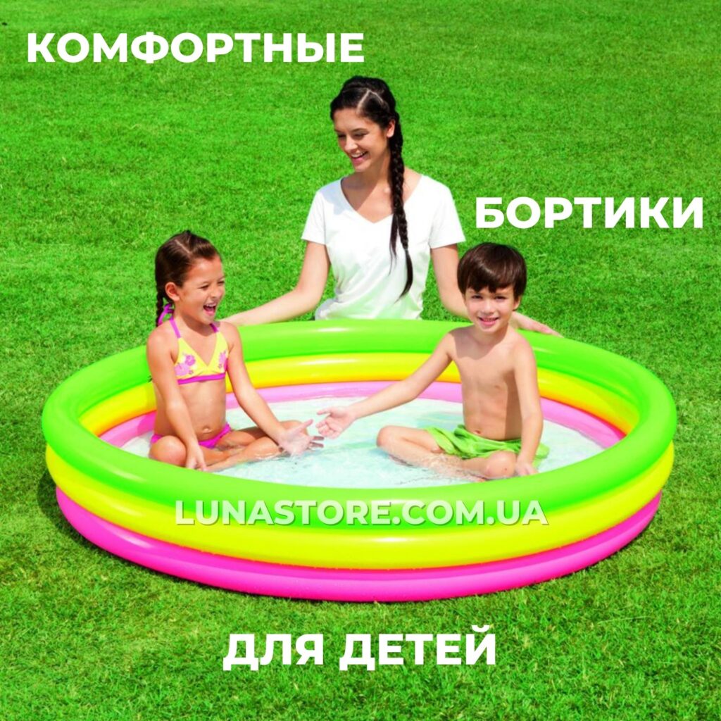 Детский бассейн Интекс  поможет вашему ребенку с пользой провести время. Это значит, что он не только будет с удовольствием плескаться в воде, получать положительные эмоции от веселых игр, но и развиваться физически. Ваш ребенок получит море удовольствия, купаясь в нем. Этот бассейн по праву станет настоящим украшением любого участка. Яркий и разноцветный бассейн для детей, состоящий из четырех надувных колец, выполнен из  высококачественного винила, предназначен для самостоятельной игры малышей от 3 лет.  Как все бассейны, его можно использовать как игровой центр, просто наполнив разноцветными шариками. Материал не вызывает аллергии. Ремкомплект прилагается.