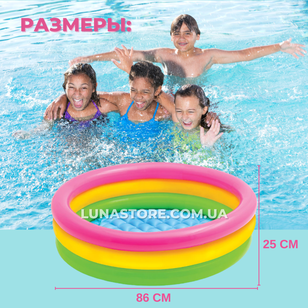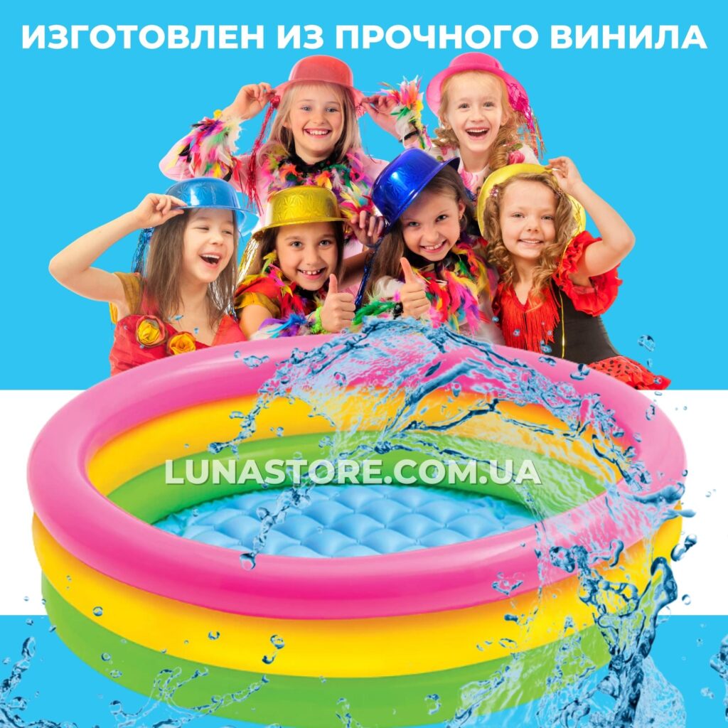 • Надувной бассейн “Весёлые колечки” выполнен в сочных радужных цветах.
