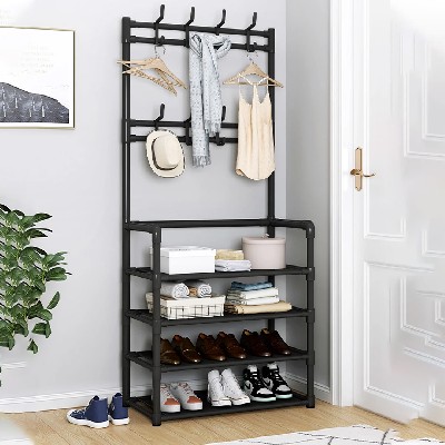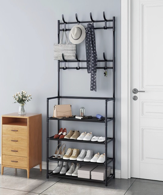 - Компактна підлогова стійка в стилі лофт з гачками для верхнього та іншого одягу і з 4 полицями для сезонного та повсякденного взуття. На настінній етажерці зручно зберігати також сумки